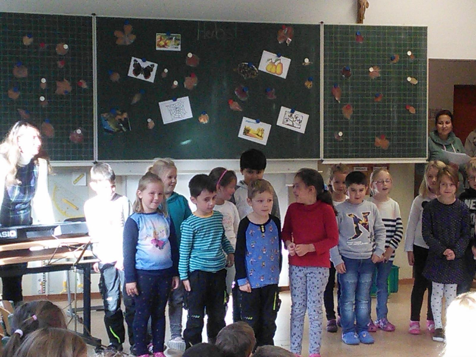 Alle Kinder der Klassen 1 bis 4 trafen sich am 24.10.2017 in der dritten Stunde zum Herbstansingen. Zuerst sangen wir gemeinsam das Lied „Ich schenk dir einen Regenbogen“.